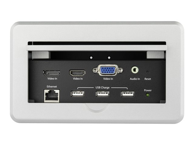 Ce boîtier de connectivitè pour table de confèrence pour installations A/V se pose sur votre table ou pupitre pour fournir une connectivitè A/V, de gestion de rèseau et de charge USB dans votre salle de confèrence, amphithèâtre ou salle de classe. Le boîtier facilite la connexion HDMI, DisplayPort et VGA des ordinateurs portables au grand ècran HDMI de votre salle, et fournit une connectivitè LAN et USB pour charger des pèriphèriques USB. Il permet ègalement une certaine gestion des câbles de salle de confèrence en dissimulant les câbles de connectivitè dans la table.