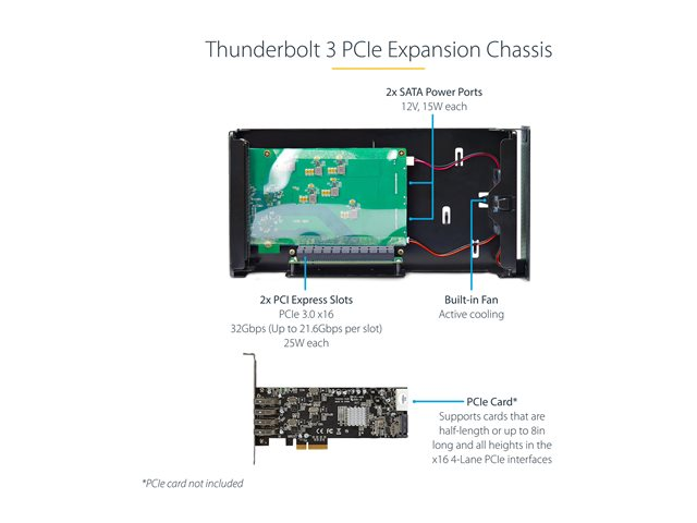 Ajoutez deux cartes compatibles PCI-Express 3.0 x16 et augmentez les capacités potentielles d'un ordinateur portable, d'un ordinateur de bureau ou d'un tout-en-un compatible Thunderbolt 3 ou 4. Ce boîtier d'extension Thunderbolt 3 PCIe vous permet de profiter de la vaste gamme de cartes d'extension PCIe avec des ordinateurs qui ne disposent pas de fentes PCIe. Le boîtier vous permet de connecter un écran externe via les ports DisplayPort (DP) ou Thunderbolt 3, prenant en charge des résolutions Ultra Haute Définition (UHD) en 4K ou 8K.