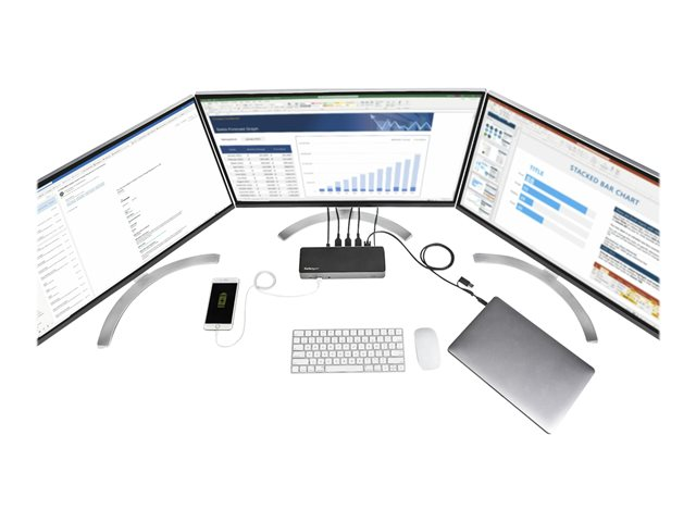 Cette station d'accueil 10 Gbit/s USB-C Gen 2 transforme votre MacBook Pro, votre ordinateur portable Windows et votre Chromebook USB-C & Thunderbolt 3 en station de travail puissante. Une station d'accueil USB 3.2 Gen 2 Type-C offre tout ce dont vous avez besoin: des sorties vidéo HDMI ou DisplayPort triples jusqu'à 4K 60 Hz, des ports périphériques10 Gbit/s USB-C & USB-A en aval et une alimentation de 85 W. Les anciens pc portables USB-A sont pris en charge par le câble USB-C/USB-A hybride inclus.