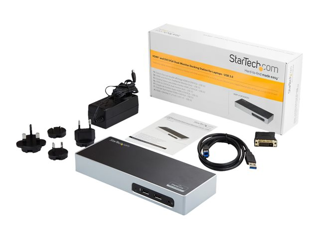 Cette station d'accueil PC USB 3.0 pour ordinateurs portables Mac et Windows vous offre la flexibilité de sortie vidéo et les ports nécessaires pour optimiser les performances de votre poste de travail. La station d'accueil PC économique à double affichage offre de nombreuses options de sortie vidéo, y compris HDMI , DVI et VGA (avec adaptateur) et vous propose six ports USB pour périphériques, dont deux ports USB de charge rapide.