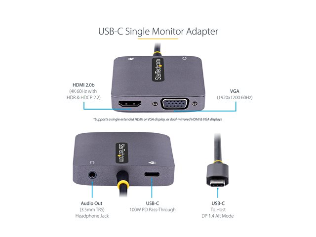 StarTech.com USB C Video Adapter, USB C to HDMI VGA Multiport Adapter w/ 3.5mm Audio Output, 4K 60Hz, HDR, 100W PD 3.0, USB C Monitor Adapter for Laptop, Thunderbolt 3/4 Compatible - USB C Display Travel Adapter (122-USBC-HDMI-4K-VGA) - station d'accueil - USB-C / Thunderbolt 3 / Thunderbolt 4 - VGA, HDMI